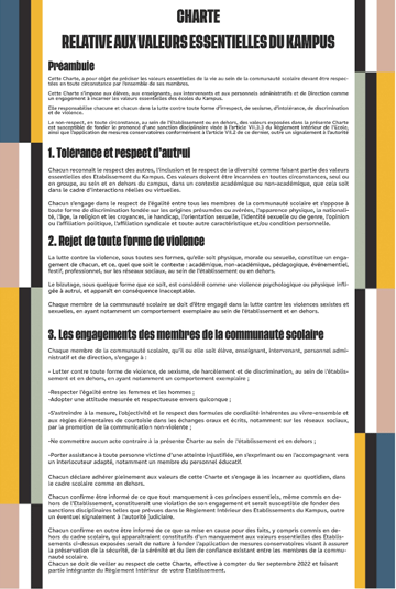 Signée par tous les étudiants, collaborateurs et prestataires de l’école, la charte des valeurs essentielles impose à chacun d’adopter une conduite exemplaire, tant au sein de l'établissement qu'à l'extérieur.