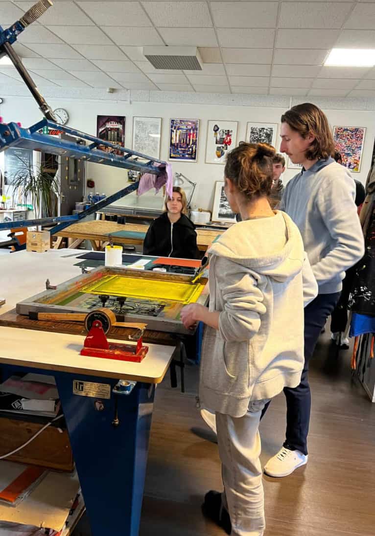 Encadrés par Éric et Anna, les étudiants ont découvert les étapes concrètes du processus : préparation des écrans, insolation, calage du textile, passage de l’encre, séchage. Ils ont rapidement compris que l’intention créative devait dialoguer avec la faisabilité technique. Un dégradé trop complexe, une typographie trop fine, un contraste mal maîtrisé… et le rendu final change radicalement.