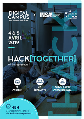 Le 4 et 5 avril, Digital Campus Lyon a organisé un Hackathon avec les étudiants entrepreneurs de l'INSA issus de la Filière Etudiant Entreprendre (FEE LyonTech) et les étudiants de 2e année du Mastère Expert en stratégie digitale porteurs des projets DC START, le pré incubateur de Digital Campus.