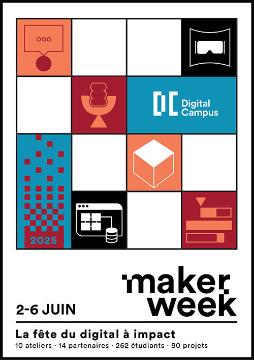 La Maker Week est le temps fort qui clôture l’année de Digital Campus à Paris, durant lequel nous réunissons les étudiants des 1re et 2e année de Mastère Expert en Stratégie Digitale pour suivre 10 ateliers thématiques animés avec nos partenaires éditeurs au profit d'un projet à impact.