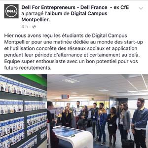 Merci à Oscar BUIJTEN, Peggy ROUFFIAC TARASEWICZ et Stephane THIALLIER pour leur accueil chaleureux ! Nos étudiants ont été ravis de cette visite et ont reçu de très bonnes impressions venant de la part de l’entreprise. En effet, sur son compte Facebook officiel, DELL Montpellier indiquait que les étudiants de Digital Campus constituent une « équipe super enthousiaste avec un bon potentiel pour vos futurs recrutements » !