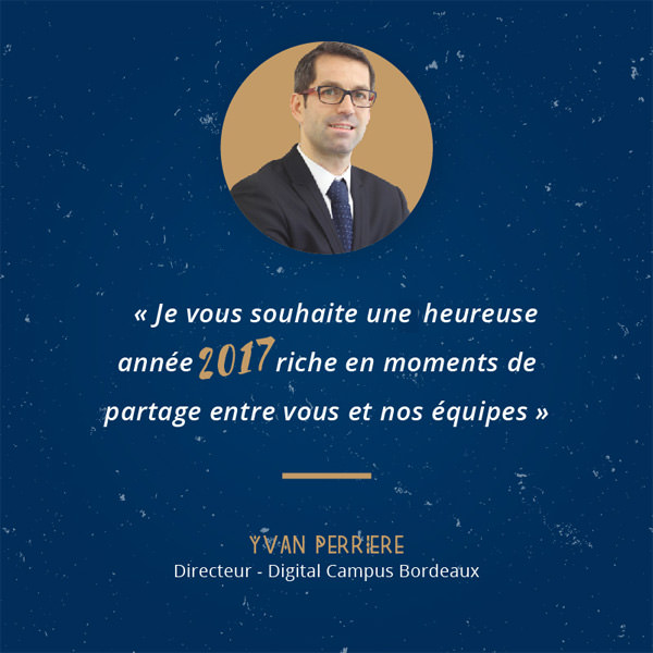« Au nom de toute l’équipe Digital Campus Bordeaux je vous souhaite une heureuse année 2017 riche en moments de partage entre vous et nos équipes sur le nouveau campus des Bassins à Flot à Bordeaux. 2017 sera marquée par une actualité riche pour Digital Campus avec le 28 mars la présentation des Grands Projets de l’année 2016-2017, les présentations des spécialisations UX, Marketing et Data lors de nos prochaines journées portes ouvertes, l’accueil dès janvier 2017 de stagiaires adultes sur l’User Interface, le Webmarketing et l’User Experience mais aussi de nombreux ateliers découvertes à l’Iboat, des projets et toujours des projets avec l’écosystème numérique de Bordeaux ! »